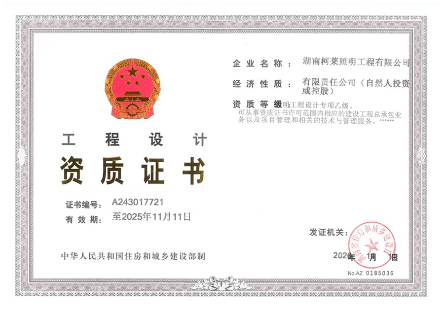 喜讯!湖南省住房和城乡建设厅给公司颁发照明工程设计专项乙级资质