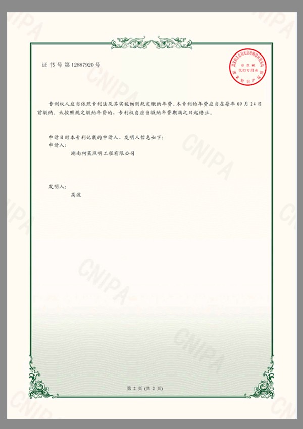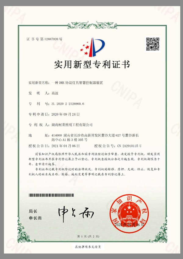 计算机软件著作权登记证书(城市夜景亮化联动控制系统软件v1.0)