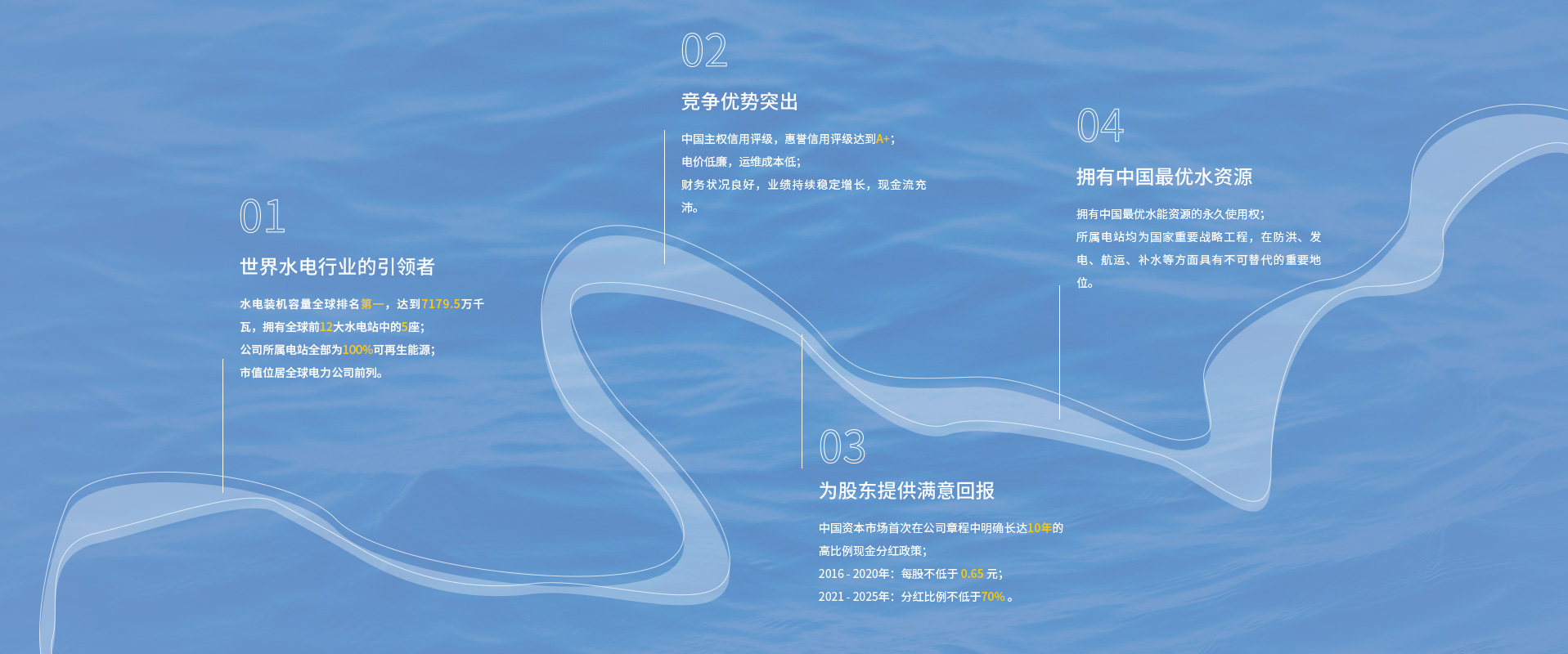 长江电力主要从事水力发电、投融资、抽水蓄能、智慧综合能源、新能源和配售电等业务,经营区域覆盖中国、秘鲁、巴西、巴基斯坦等多个国家,是中国最大的电力上市公司和全球最大的水电上市公司。长江电力运营管理的乌东德、白鹤滩、溪洛渡、向家坝、三峡、葛洲坝六座梯级电站,构成了世界最大清洁能源走廊,有效保障了长江流域防洪、航运、补水和生态安全,为我国经济社会绿色发展提供了强劲动能。